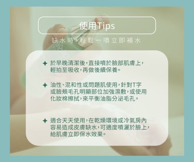 早晚洗完臉後,依照個人保養習慣,在臉部肌膚上直接噴灑,或是噴灑於化妝棉上(做再一次清潔步驟),輕輕擦拭,再配合後續保養。